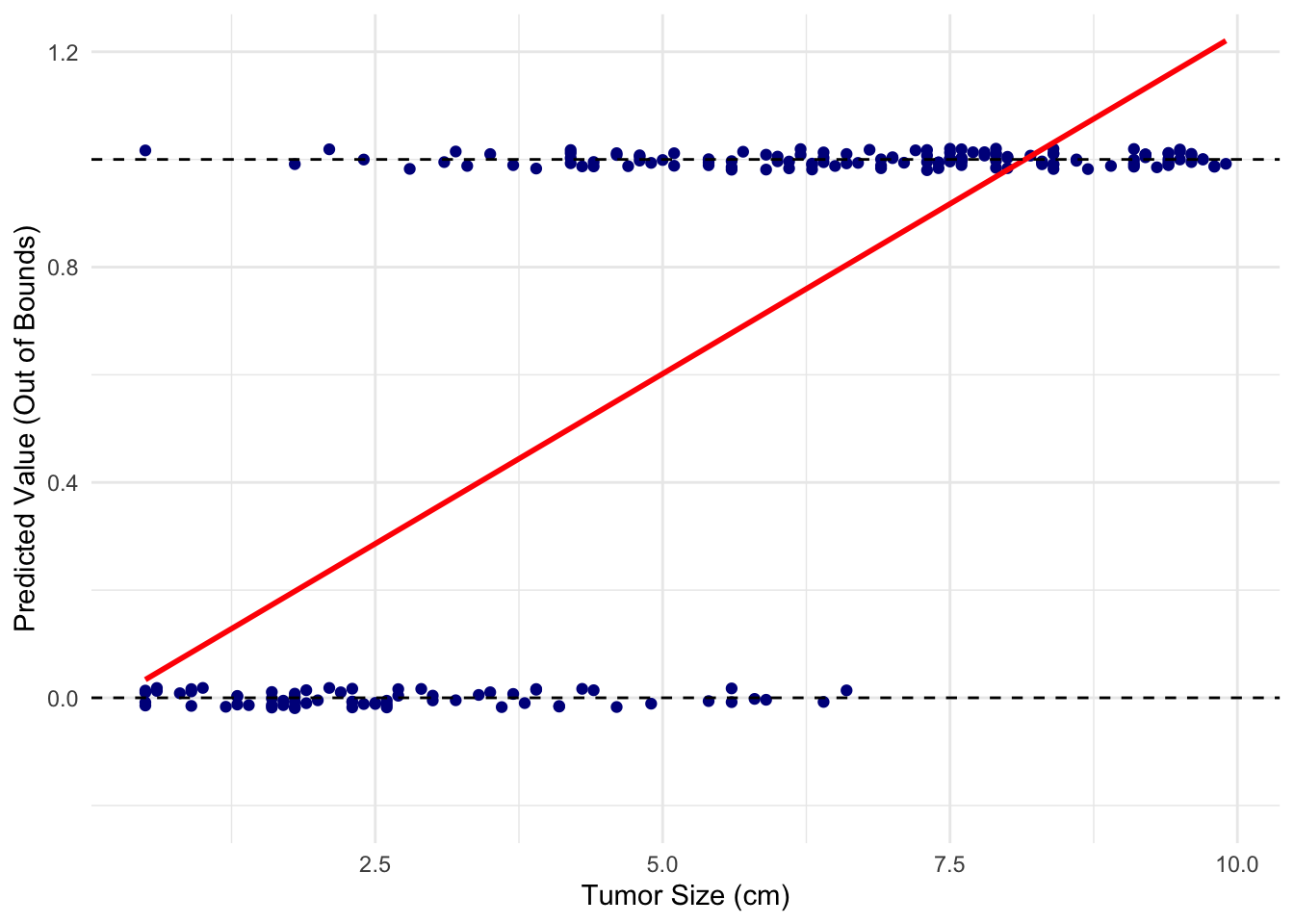 When applied to a binary clinical outcome (absence or presence of a disease, benign or malignant. alive or dead), the linear fit does not make sense when trying to model binary outcomes.