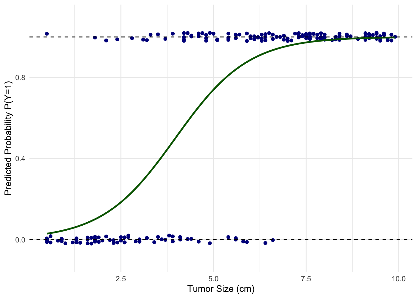 Now we have a valid probability that enables us to predict malignancy based on the tumor size.